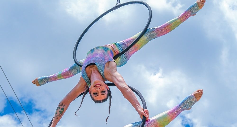 One of the most distinctive aspects of Aerial City is how fully it has committed to fire and flow arts as a core part of its identity, not an add-on. Fire performance is taught through private lessons and workshops with an 18+ requirement and proper safety protocol. The monthly jam specifically brings fire and flow front and center alongside aerial and acro yoga, and the entertainment hire roster features fire performers prominently.